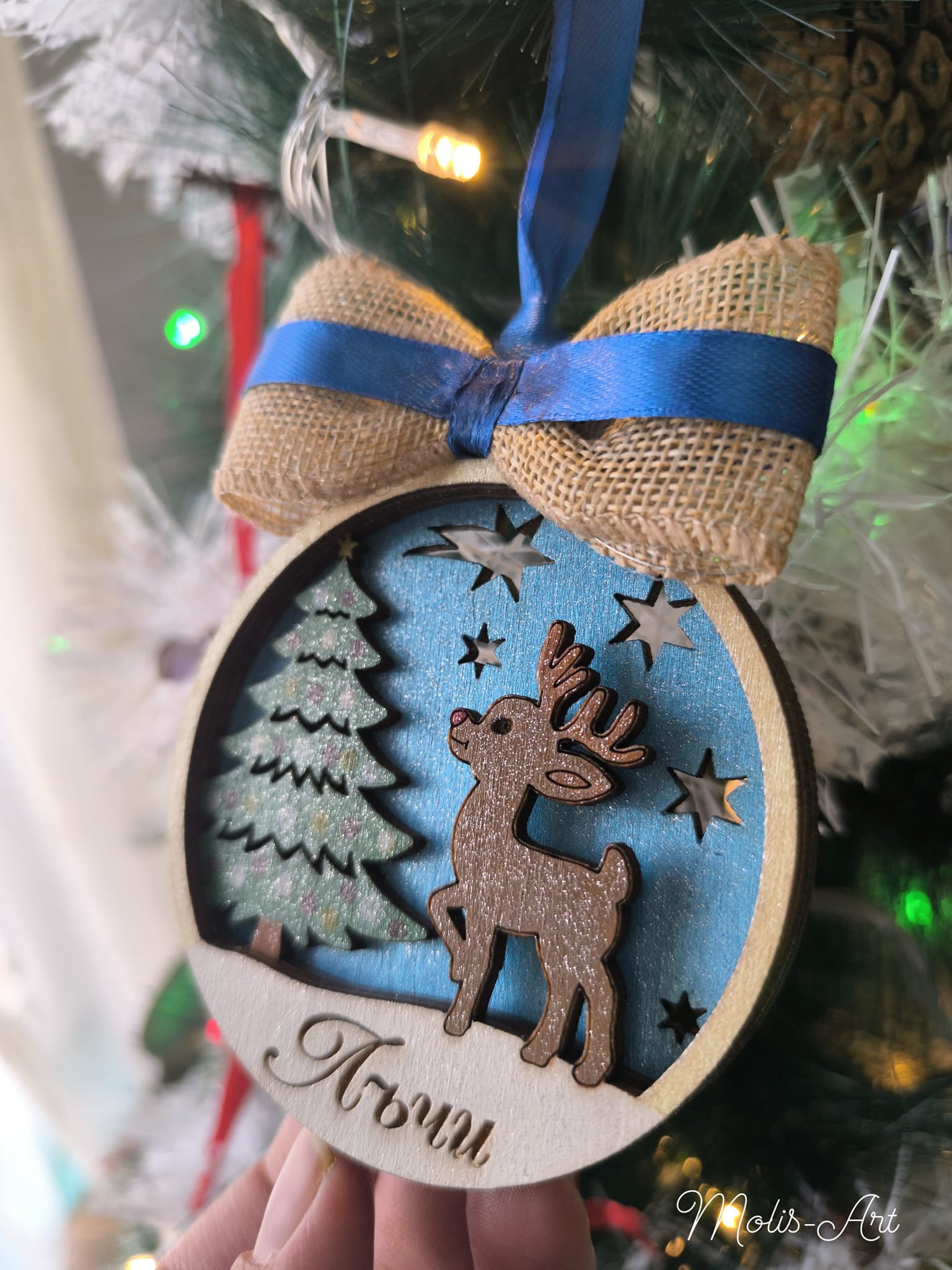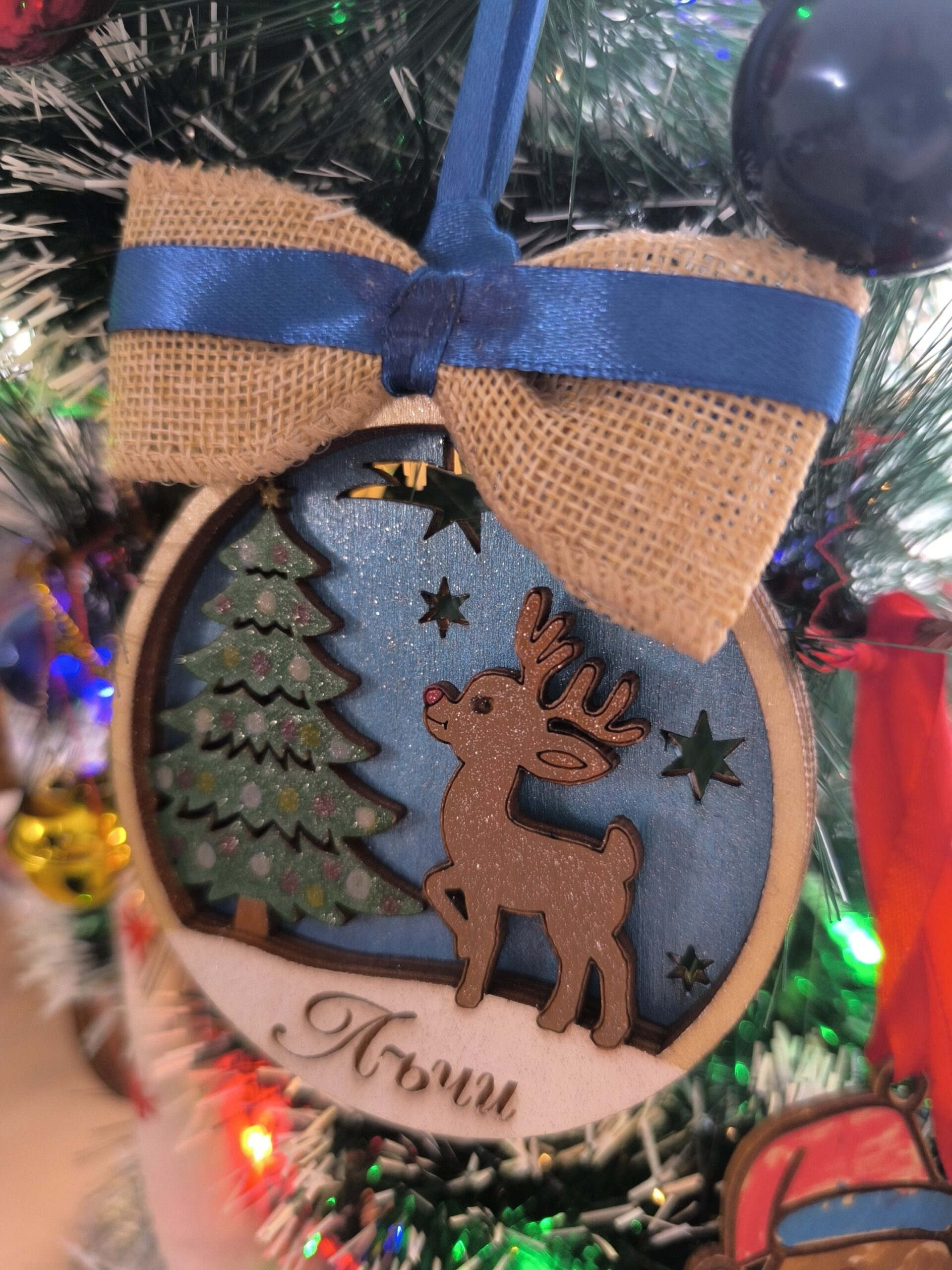 🎀 Коледна висулка от три слоя дърво – блестящ зимен пейзаж с еленче и снежна сцена. С име по желание – за уникална елха тази Коледа. 🎄